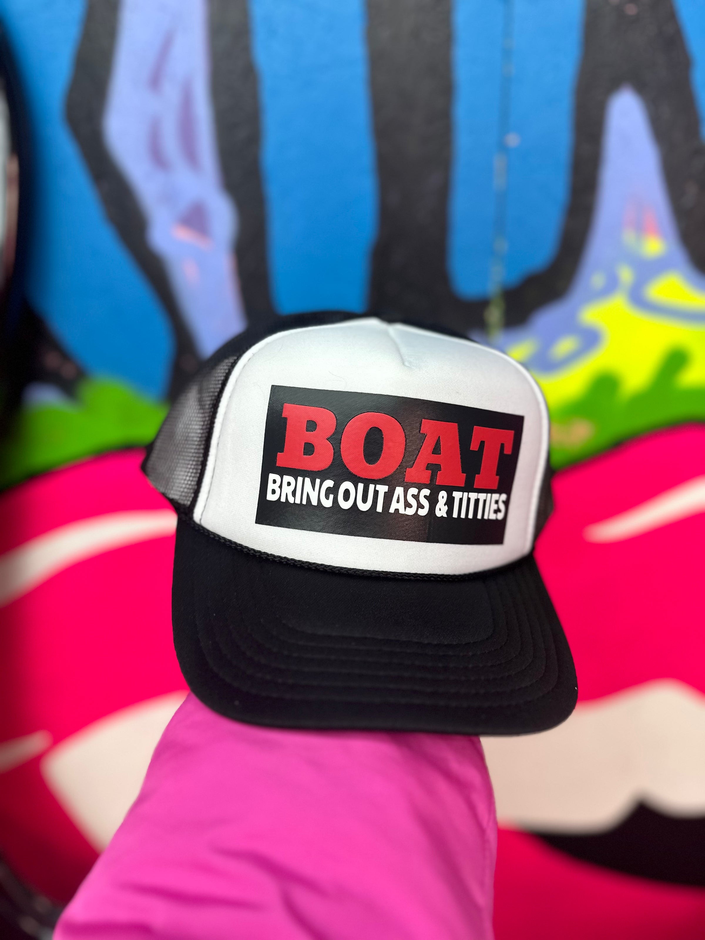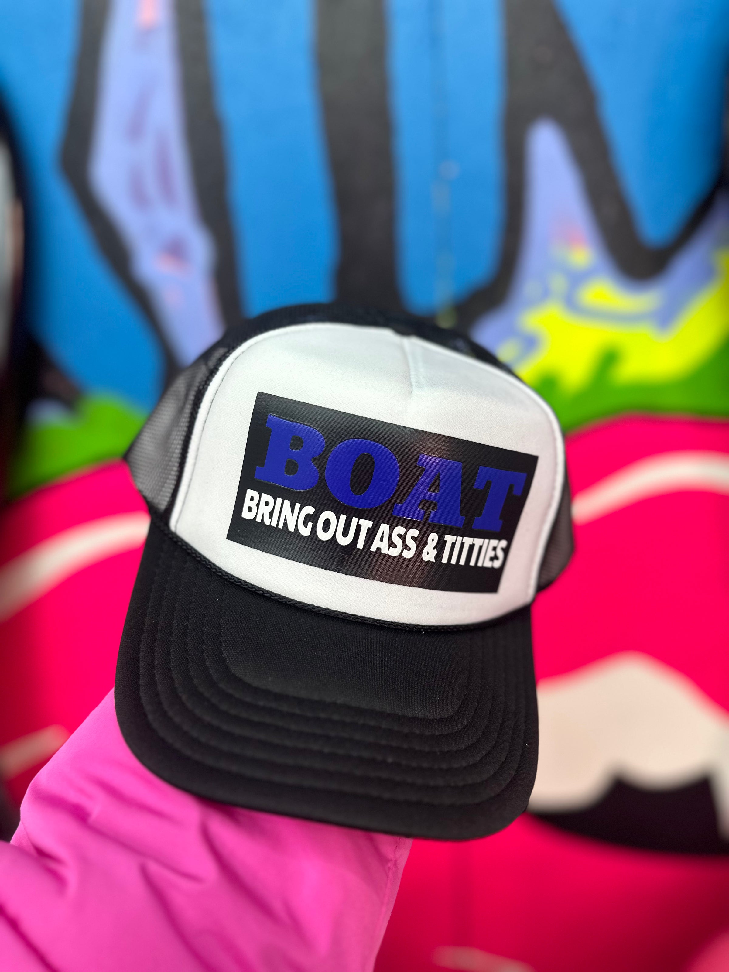 Get your head in the game with the BOAT Trucker Hat. This hat brings out the fun and naughty side in you with its cheeky phrase "Bring out ass and titties". Available in various colors, this hat is perfect for adding a touch of humor to any outfit. Don't be afraid to show off your wild side!